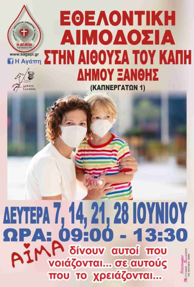 Η αιμοδοσία θα πραγματοποιηθεί τη Δευτέρα 14 Ιουνίου 2021 από τις 9πμ έως τις 13:30μμ. στο κεντρικό ΚΑΠΗ του Δήμου Ξάνθης , στην πλατεία Μπαλτατζή, σε συνεργασία με την κινητή μονάδα αιμοδοσίας του Γενικού Νοσοκομείου Ξάνθης.