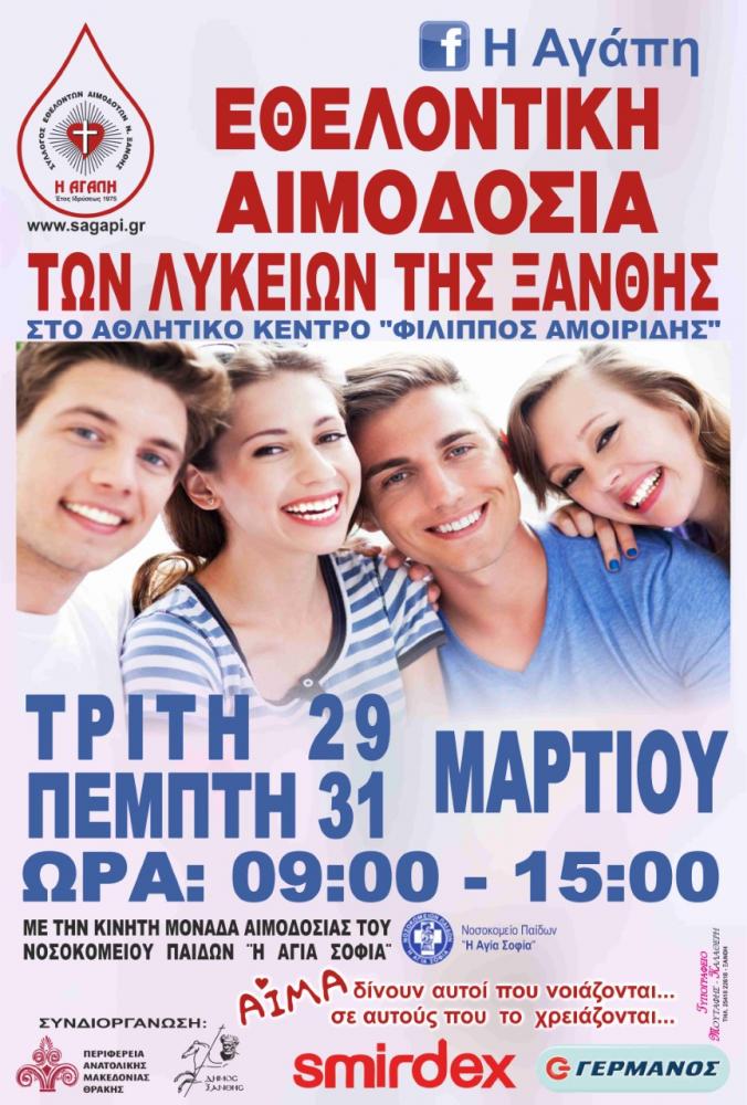 Πρόκειται για μια αιμοδοσία που έχει σκοπό να συμμετάσχουν κυρίως τα παιδιά μας, μαθητές της Γ' Λυκείου όλων των Λυκείων της Ξάνθης μαζί με τους καθηγητές τους και τους γονείς των μαθητών.