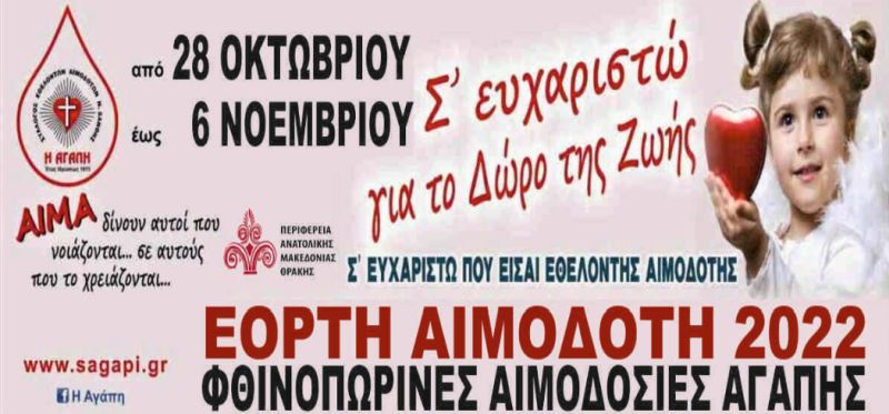 Το Δ.Σ. του Συλλόγου Εθελοντών Αιμοδοτών Ν. Ξάνθης «Η ΑΓΑΠΗ» ενημερώνει ότι ξεκινάνε από την Παρασκευή 28 Οκτωβρίου έως και την Κυριακή 6 Νοεμβρίου οι ΦΘΙΝΟΠΩΡΙΝΕΣ ΑΙΜΟΔΟΣΙΕΣ ΑΓΑΠΗΣ 2022 σε συνεργασία με την κινητή μονάδα αιμοδοσίας του Νοσοκομείου Παίδων «Η ΑΓΙΑ ΣΟΦΙΑ»