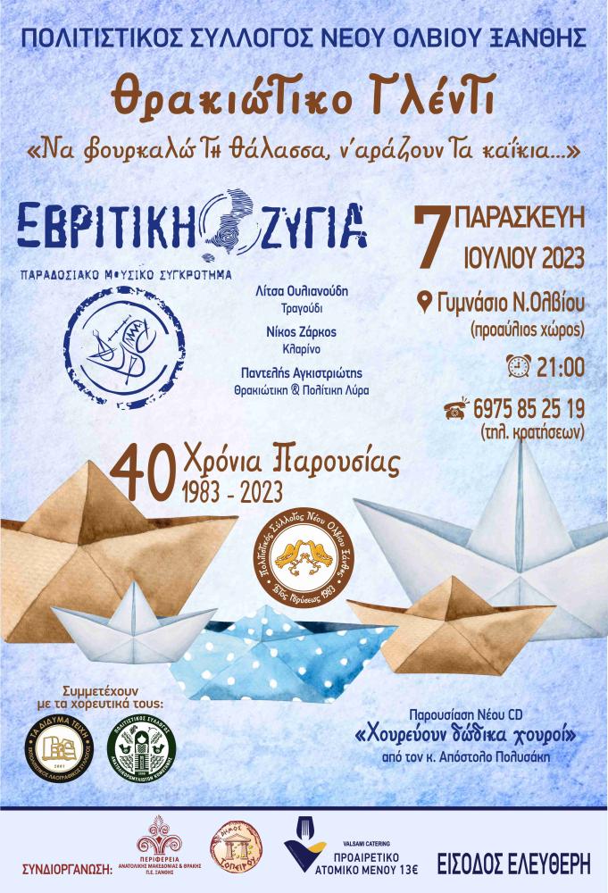 Ο πολιτιστικός σύλλογος Νέου Ολβίου, σε συνεργασία με την περιφέρεια ΑΜΘ και το Δήμο Τοπείρου, διοργανώνει στις 7 Ιουλίου, στις 21:00, στο προαύλιο του Γυμνασίου Ν.Ολβίου, την εκδήλωση ‘Να φουρκαλώ τη θάλασσα, ν’ αράζουν τα καΐκια’, για να γιορτάσει τα 40 χρόνια από την ίδρυση του συλλόγου.