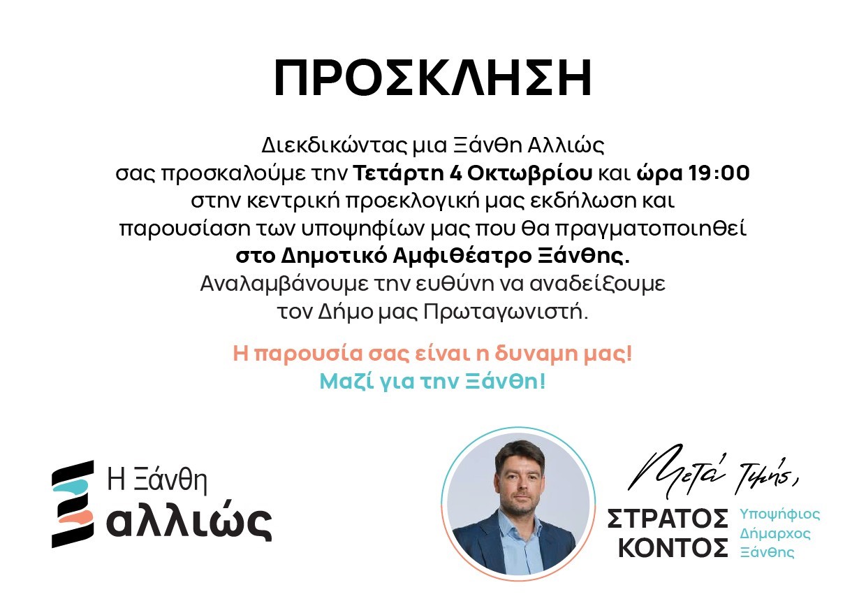 » Την Τετάρτη 4 Οκτωβρίου στις 19.00 η κεντρική προεκλογική ομιλία του Στράτου Κοντού στο Δημοτικό Αμφιθέατρο Ξάνθης