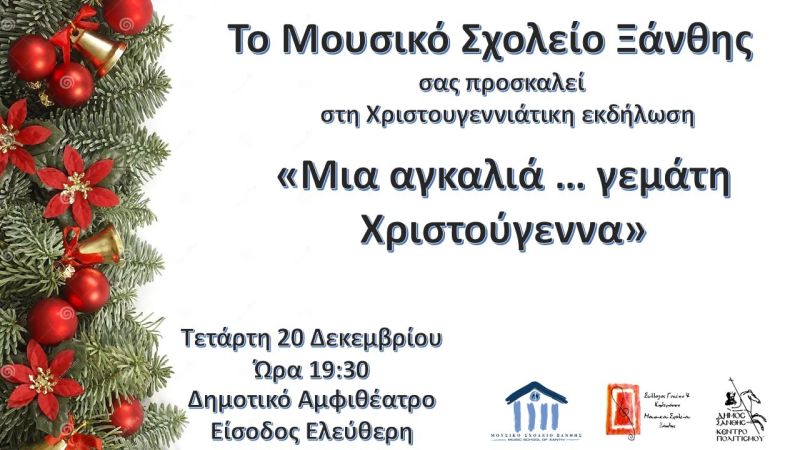 Το Μουσικό Σχολείο Ξάνθης και ο Δήμος Ξάνθης συνδιοργανώνουν ττη Χριστουγεννιάτικη Συναυλία με τίτλο “Μια αγκαλιά γεμάτη... Χριστούγεννα” που θα πραγματοποιηθεί την Τετάρτη, 20 Δεκεμβρίου και ώρα 19:30 στο Δημοτικό Αμφιθέατρο Ξάνθης. Τα Μουσικά Σύνολα του Μουσικού Σχολείου με ένα πλούσιο πρόγραμμα, γεμάτο αγάπη, καλοσύνη και θαλπωρή, θα μας εισαγάγουν στο πνεύμα των Χριστουγέννων.