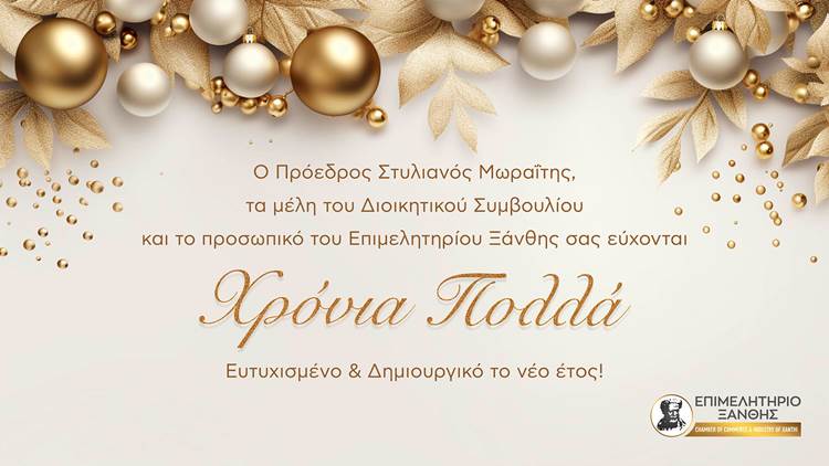 Ο Πρόεδρος Στυλιανός Μωραίτης τα μέλη του Διοικητικού Συμβουλίου και το προσωπικό του Επιμελητηρίου Ξάνθης σας Εύχονται Χρόνια Πολλά. Ευτηχισμένο και Δημιουργικό το νέο Έτος.