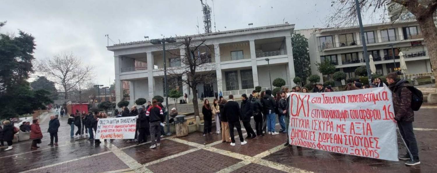 Τα σχέδια της κυβέρνησης να περάσει το νομοσχέδιο-έκτρωμα εν μέσω εξεταστικής για τα ιδιωτικά πανεπιστήμια και να επιβάλλει σιγή νεκροταφείου δεν θα περάσει. Σε συνέχεια των κινητοποιήσεων των φοιτητικών συλλόγων στην Ξάνθη αλλά και πανελλαδικά, μέσα από μαζικές διαδικασίες, καταλήψεις και κινητοποιήσεις, σύσσωμη η φοιτητική κοινότητα μαζί με μαθητές και εκπαιδευτικούς ξεκαθαρίσαμε: ΝΑ ΑΠΟΣΥΡΘΕΙ ΤΟ ΝΟΜΟΣΧΕΔΙΟ.