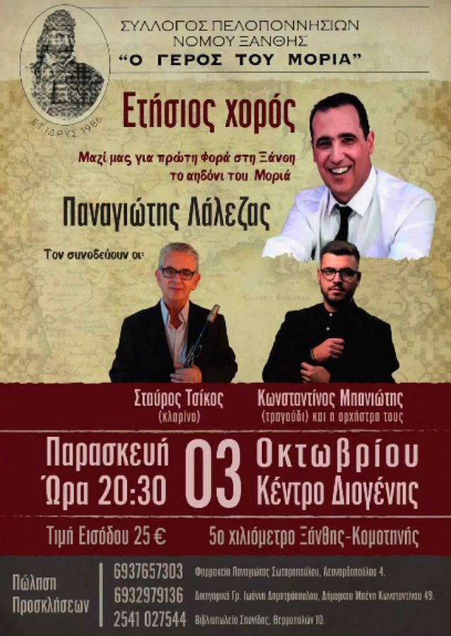 Τον ετήσιο χορό του διοργανώνει ο Σύλλογος Πελοποννησίων Ξάνθης « Ο Γέρος του Μοριά», την Παρασκευή 3 Οκτωβρίου, στις 20:30 μ.μ. στο κέντρο Διογένης.