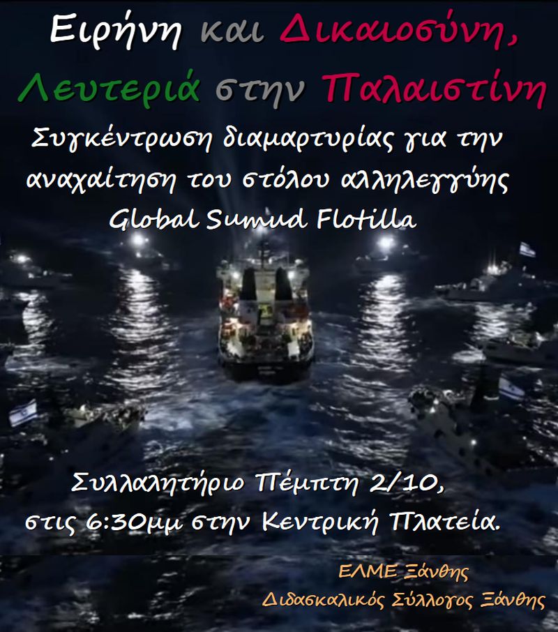 Εχθές το βράδυ η Ισραηλινή κυβέρνηση επιτέθηκε στον διεθνή στόλο αλληλεγγύης Global Sumud Flotilla που επιχειρεί να σπάσει τον αποκλεισμό της Γάζας και να παραδώσει ανθρωπιστική βοήθεια. Στον στολίσκο συμμετέχει και ελληνική αποστολή. Το πλήρωμα είναι άοπλο και έχει μοναδικό σκοπό την παροχή φαγητού, φαρμάκων και ελπίδας στον Παλαιστινιακό λαό, που εδώ και δύο χρόνια βιώνει την απόπειρα αφανισμού του, μέσω γενοκτονίας. Η είσοδος στη Γάζα θα αποτελέσει και ένα συμβολικό σπάσιμο της πολιορκίας της από τα ισραηλινά στρατεύματα και θα δημιουργήσει νέα δεδομένα.