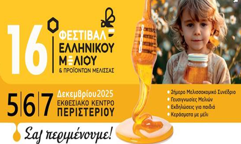 Το μεγάλο γιορτινό ραντεβού του κόσμου της μελισσοκομίας, το 16ο Φεστιβάλ Ελληνικού Μελιού & Προϊόντων Μέλισσας, διοργανώνεται στις 5, 6 και 7 Δεκεμβρίου 2025, στο σύγχρονο Εκθεσιακό Κέντρο Περιστερίου.