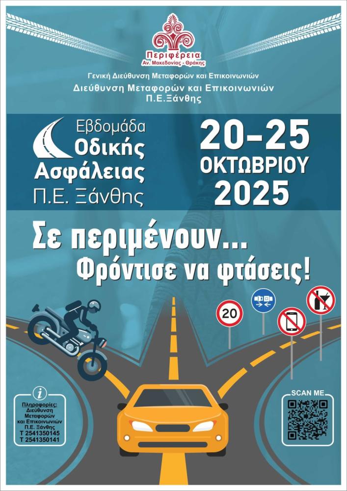 Η Περιφέρεια Ανατολικής Μακεδονίας και Θράκης / Γενική Διεύθυνση Μεταφορών και Επικοινωνιών και η Διεύθυνση Μεταφορών και Επικοινωνιών Π.Ε. Ξάνθης, διοργανώνει από τις 20 έως τις 25 Οκτωβρίου 2025 την «Εβδομάδα Οδικής Ασφάλειας» στην Ξάνθη, με κεντρικό μήνυμα: «Σε περιμένουν… Φρόντισε να φτάσεις!».