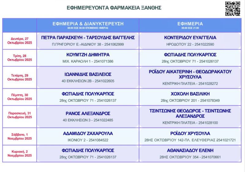 Δείτε τα εφημερεύοντα φαρμακεία από τη Δευτέρα 27 Οκτωβρίου έως και την Κυριακή 2 Νοεμβρίου 2025 στην Ξάνθη