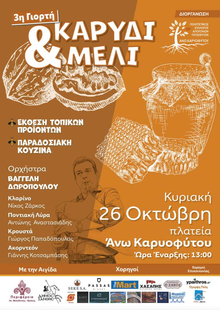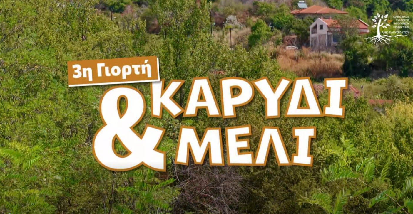 Ο Σύλλογος Απογόνων Προσφύγων Άνω Καρυοφύτου Ξάνθης διοργανώνει την 3η Γιορτή «Καρύδι και Μέλι» επιφυλάσσοντας πολλές εκπλήξεις για τους παρευρισκόμενους.