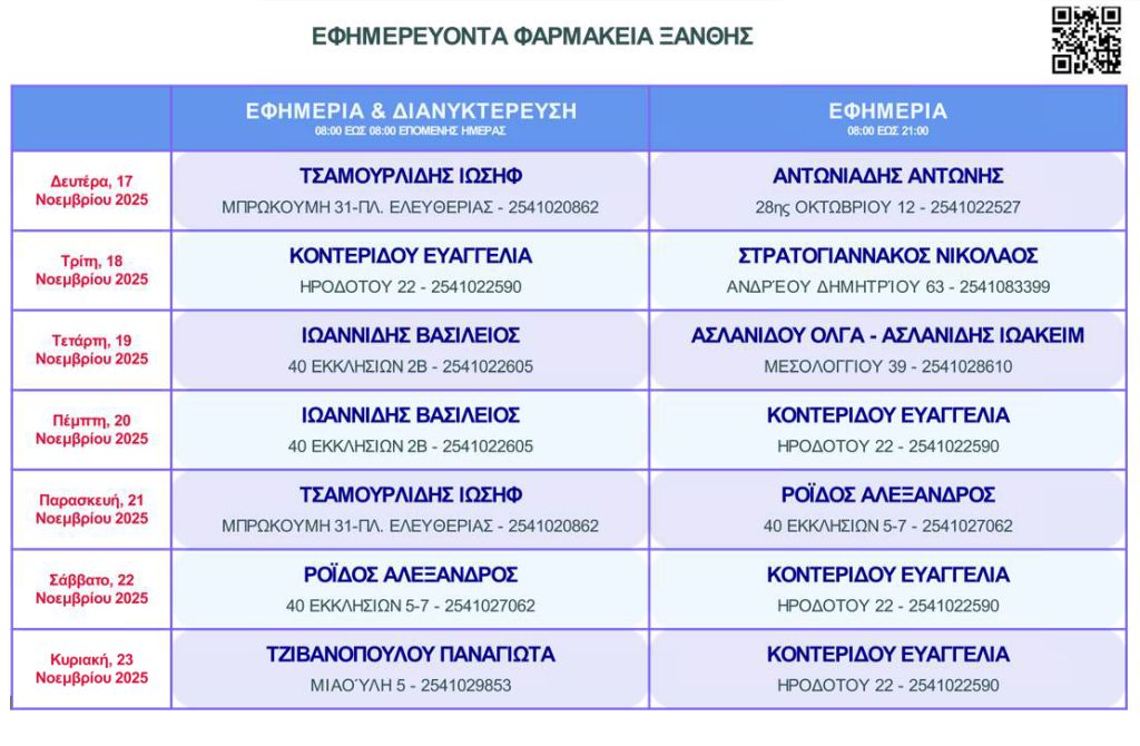 Δείτε τα εφημερεύοντα φαρμακεία από τη Δευτέρα 17 έως και την Κυριακή 23 Νοεμβρίου 2025 στην Ξάνθη