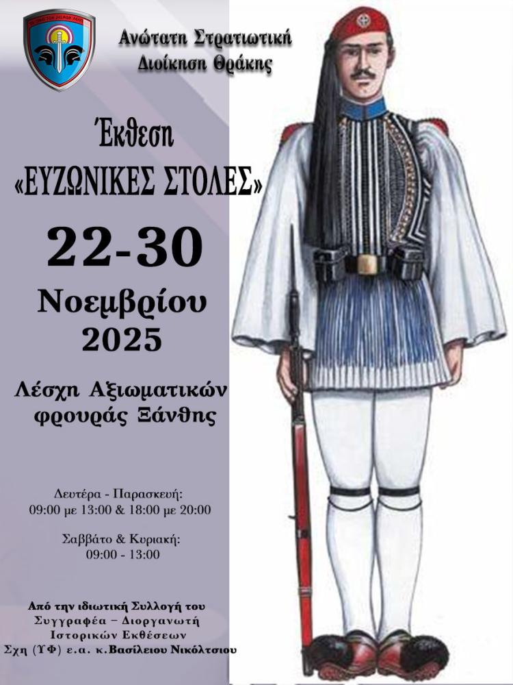 γ. Έκθεση του Σχη (ΥΦ) ε.α. Βασίλειου Νικόλτσιου, με θέμα «Ευζωνικές Στολές από το 1821 μέχρι και Σήμερα» , στο φουαγιέ του παραπάνω αμφιθεάτρου την Παρασκευή 21 Νοε 25 και ώρα 18:00, όπου έπειτα θα μεταφερθεί στην ΛΑΦ ΞΑΝΘΗΣ από Σάββατο 22 μέχρι την Κυριακή 30 Νοε 25.