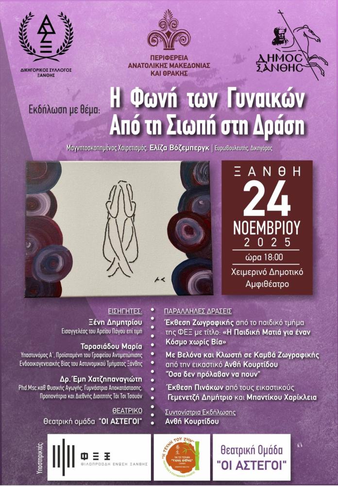 Στο πλαίσιο της Διεθνούς Ημέρας εξάλειψης της Βίας κατά των Γυναικών, ο Δικηγορικός Σύλλογος Ξάνθης, η Επιτροπή Ισότητας φύλων Περιφέρειας Ανατολικής Μακεδονίας –Θράκης και η Δημοτική Επιτροπή Ισότητας φύλων Δήμου Ξάνθης, διοργανώνουν εκδήλωση με θέμα: «Η ΦΩΝΗ ΤΩΝ ΓΥΝΑΙΚΩΝ-ΑΠΟ ΤΗΝ ΣΙΩΠΗ ΣΤΗΝ ΔΡΑΣΗ» , τη Δευτέρα 24 Νοεμβρίου 2025 και ώρα 18:00 μ.μ., στο Δημοτικό Αμφιθέατρο Ξάνθης.