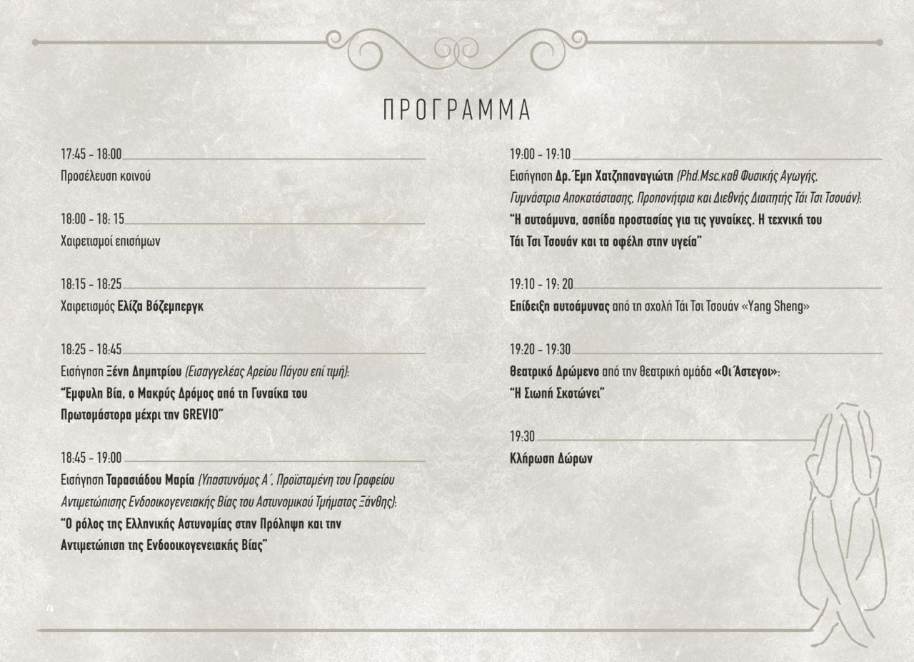 Εισηγητές: Ξένη Δημητρίου, εισαγγελέας Αρείου Πάγου επί τιμή, Μαρία Ταρασιάδου υπαστυνόμος Α΄, προϊσταμένη του Γραφείου Αντιμετώπισης Ενδοοικογενειακής βίας του Αστυνομκού Τμήματος Ξάνθης, Δρ. Έμη Χατζηπαναγιώτη Phd.Msc καθ. Φυσικής Αγωγής Γυμνάστρια Αποκατάστασης, προπονήτρια και διεθνής διαιτητής Τάι Τσι Τσουάν. Θα προβληθεί μαγνητοσκοπημένος χαιρετισμός της Ελίζας Βόζεμπεργκ, ευρωβουλευτής, δικηγόρος.