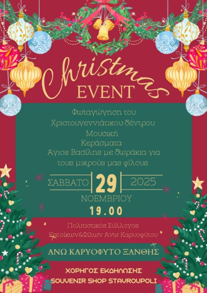Φέτος ο Αϊ-Βασίλης θα ξεκινήσει από το Άνω Καρυόφυτο. Το Άνω Καρυόφυτο, ο πανέμορφος ορεινός οικισμός της Ξάνθης, φοράει τα γιορτινά του και μπαίνει στο πνεύμα των Χριστουγέννων με την εορταστική εκδήλωση, που διοργανώνει το Σάββατο 29 Νοεμβρίου 2025, στις 19:00 μ.μ., ο Πολιτιστικός Σύλλογος Κατοίκων και Φίλων Άνω Καρυόφυτου.