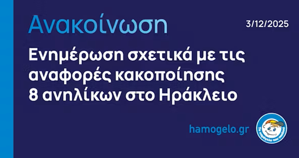 Ενημέρωση, από «Το Χαμόγελο του Παιδιού» σχετικά με τις αναφορές κακοποίησης 8 ανηλίκων, στο Ηράκλειο