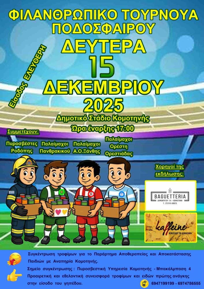 Οι Πυροσβέστες Ροδόπης, ενώνουν τις δυνάμεις τους με τους παλαίμαχους ποδοσφαιριστές του Πανθρακικού, του Α.Ο. Ξάνθης και του Ορέστη Ορεστιάδας και διοργανώνουν ένα φιλανθρωπικό τουρνουά ποδοσφαίρου, με σκοπό τη συγκέντρωση τροφίμων και ειδών πρώτης ανάγκης για το Παράρτημα Αποθεραπείας και Αποκατάστασης Παιδιών με Αναπηρία Κομοτηνής.