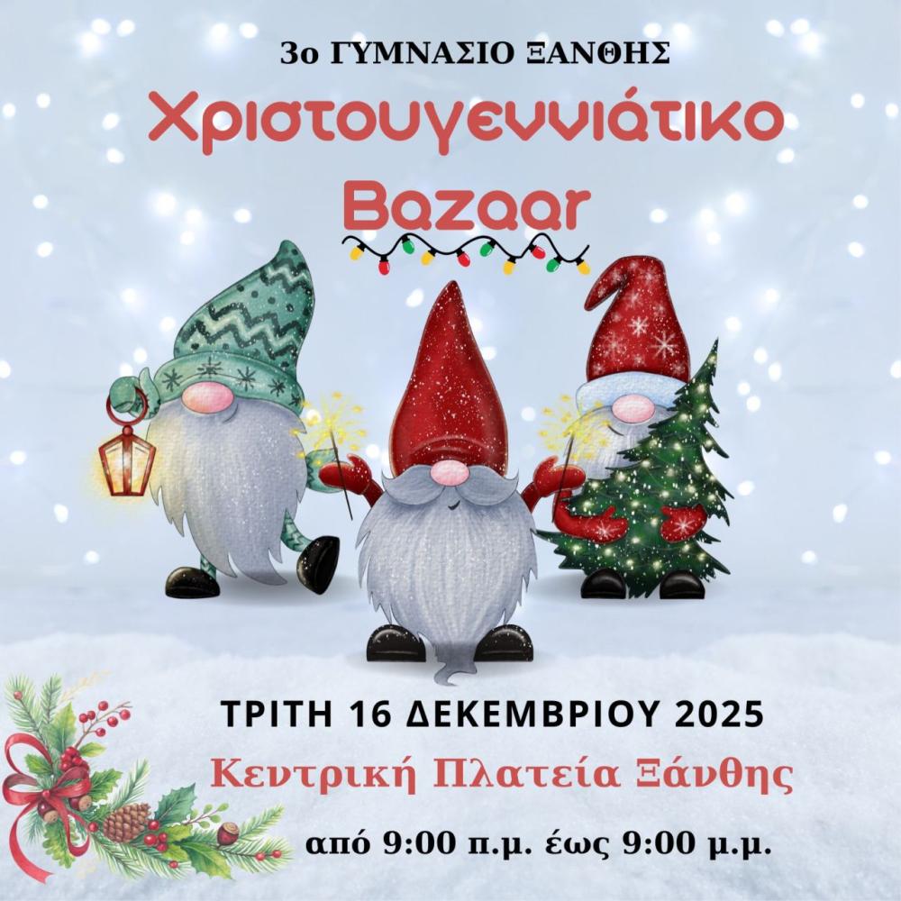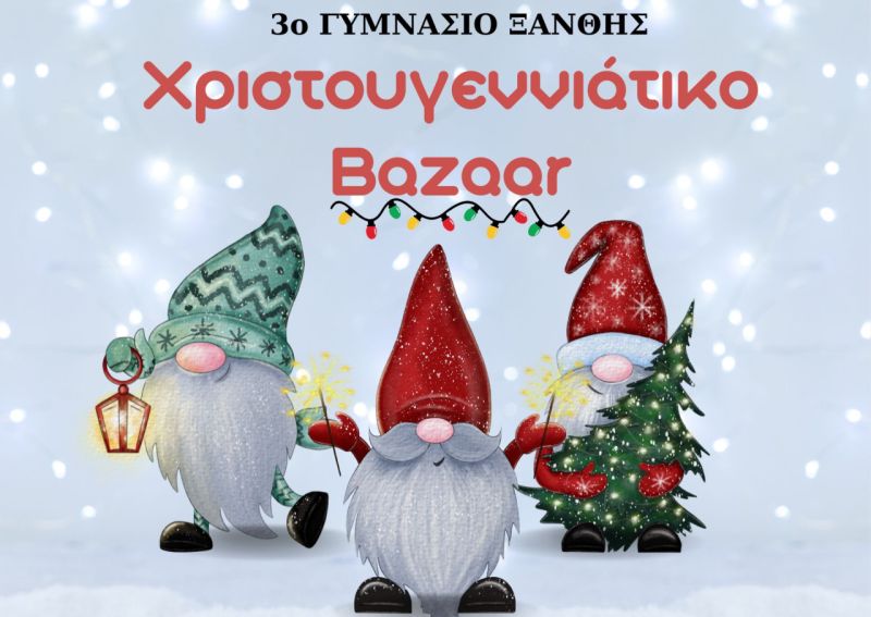 Χριστουγεννιάτικο bazaar διοργανώνει το 3ο Γυμνάσιο Ξάνθης σε συνεργασία με το 15μελές μαθητικό συμβούλιο και τον Σύλλογο Γονέων και Κηδεμόνων του σχολείου, την Τρίτη 16 Δεκεμβρίου από τις 9 το πρωί έως τις 9 το βράδυ, στην Ευχούπολη.