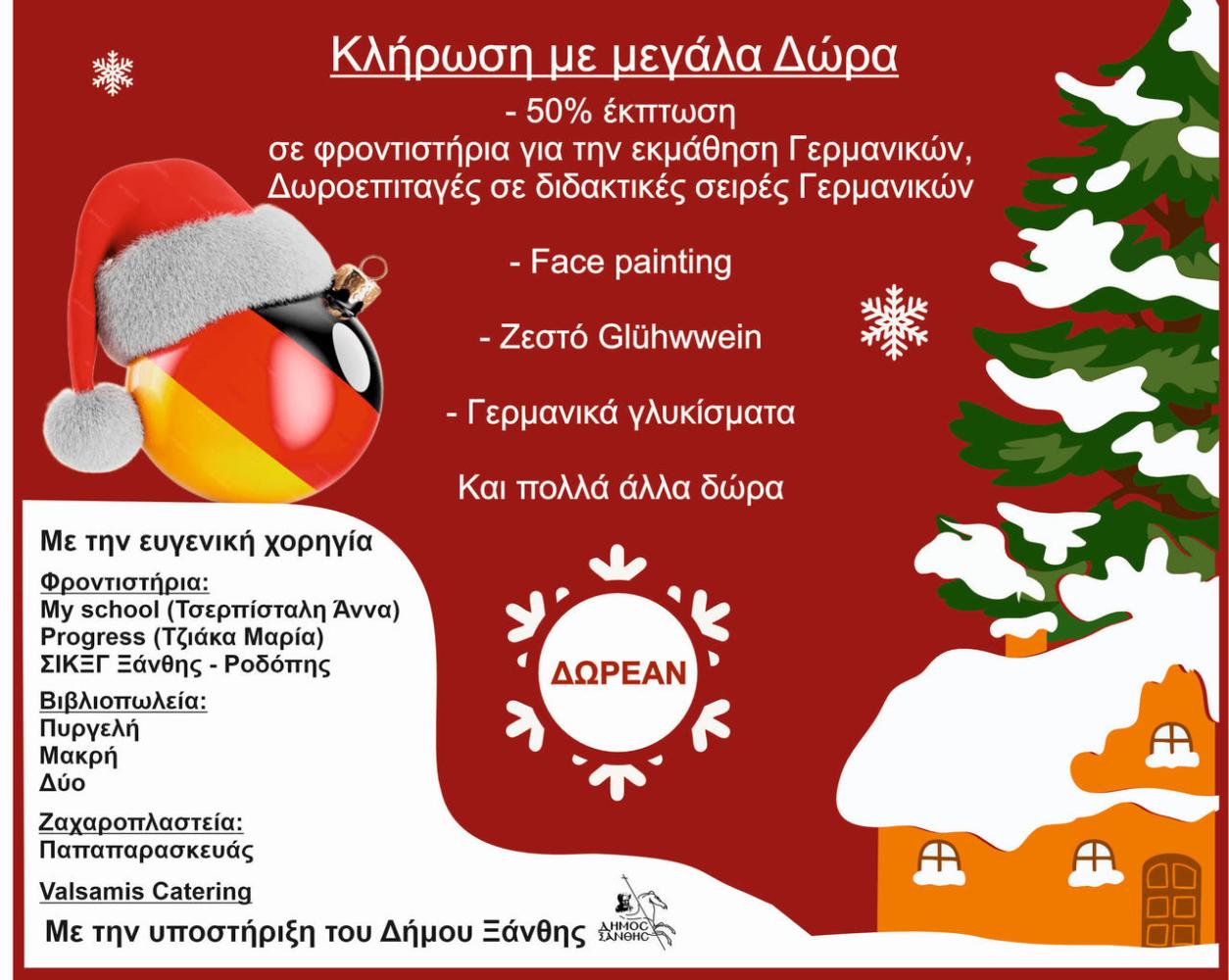 Στο πλαίσιο των Χριστουγεννιάτικων εκδηλώσεων του Δήμου Ξάνθης, η Τοπική Επιτροπή καθηγητών γερμανικής γλώσσας διοργανώνει τη Χριστουγεννιάτικη Γιορτή «Με άρωμα Γερμανίας».
