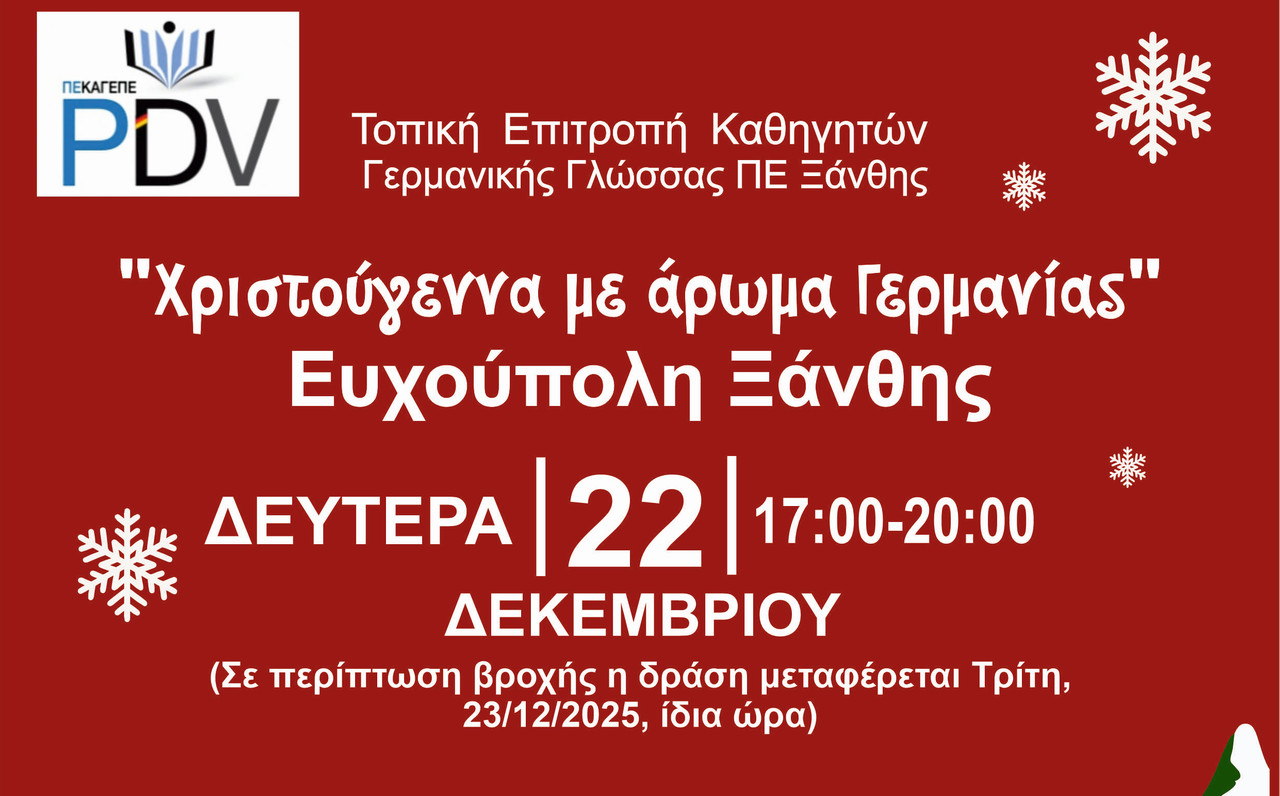 Η Τοπική Επιτροπή καθηγητών γερμανικής γλώσσας Ξάνθης, ανοίγει την αγκαλιά της και θα υποδεχτεί με μεγάλη χαρά, όλους όσους επιλέξουμε να βρεθούμε τη Δευτέρα 22 Δεκεμβρίου 2025, από τις 17:00 έως τις 20:00, στην Ευχούπολη του Δήμου Ξάνθης... και επειδή ο καιρός παίζει και τα δικά του παιχνίδια .... αν κάτι δεν πάει με τον καιρό, καλά..... η εκδήλωση θα πραγματοποιηθεί την Τρίτη 23 Δεκεμβρίου.