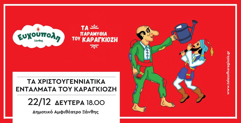 Ο Θίασος Σκιών «Τα παραμύθια του Καραγκιόζη» παρουσιάζει την εορταστική παράσταση θεάτρου σκιών «Τα χριστουγεννιάτικα εντάλματα του Καραγκιόζη». Η παράσταση θα λάβει χώρα στο Δημοτικό Αμφιθέατρο της Ξάνθης, τη Δευτέρα 22 Δεκεμβρίου στις 18:00 με ελεύθερη είσοδο.