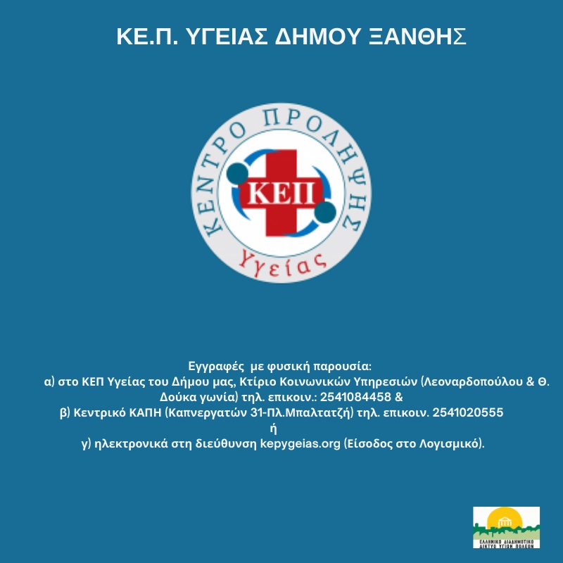Ο Δήμος Ξάνθης ως μέλος του Ελληνικού Διαδημοτικού Δικτύου Υγιών Πόλεων, ενημερώνει για την έναρξη λειτουργίας του ΚΕΠ Υγείας και της διαδικασίας εγγραφών για τους δημότες. Στόχος του ΚΕΠ Υγείας είναι η ενημέρωση και ευαισθητοποίηση των πολιτών σε θέματα πρόληψης και προσυμπτωματικού ελέγχου, καθώς και η οργάνωση προληπτικών εξετάσεων για τα παρακάτω 12 βασικά νοσήματα, σύμφωνα με τις οδηγίες του Παγκόσμιου Οργανισμού Υγείας.