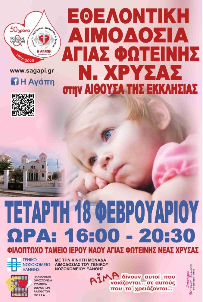 Σας καλούμε λοιπόν στην δέκατη εθελοντική αιμοδοσία του έτους 2026, την Τετάρτη 18 Φεβρουαρίου 2026 από τις 16:00 μμ έως και τις 20:30 μμ στην ενοριακή αίθουσα της Αγίας Φωτεινής Νέας Χρύσας.