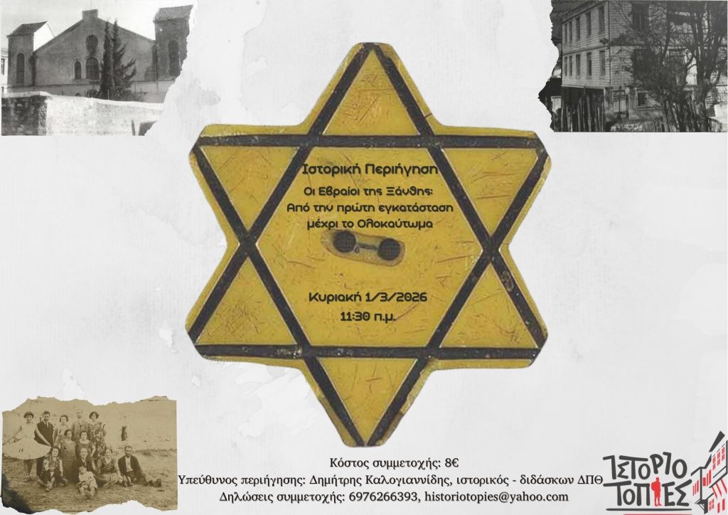 Με αφορμή τη συμπλήρωση 83 χρόνων από τη σύλληψη και τον εκτοπισμό των Εβραίων της βουλγαροκρατούμενης ζώνης την Κυριακή στις 1 Μαρτίου 2026 οι Ιστοριοτοπίες θα πραγματοποιήσουν μια ιστορική περιήγηση με θέμα την Εβραϊκή Κοινότητα της Ξάνθης. Περπατώντας σε διάφορα σημεία της πόλης που συνδέονται με την εβραϊκή παρουσία θα γνωρίσουμε την ιστορία των Εβραίων της Ξάνθης από τα πρώτα χρόνια της εγκατάστασής τους στην περιοχή μέχρι και το βίαιο εκτοπισμό τους που έλαβε χώρα κατά τη διάρκεια των χρόνων της βουλγαρικής κατοχής. Με τον τρόπο αυτό θα γνωρίσουμε ένα λησμονημένο κομμάτι της τοπικής ιστορίας, θα αναδείξουμε τα ιδιαίτερα χαρακτηριστικά της Εβραϊκής Κοινότητας της πόλης και θα κατανοήσουμε τα γεγονότα αυτής της ταραγμένης περιόδου, καθώς και τον αντίκτυπο που είχαν στη ζωή των Εβραίων της περιοχής, οι οποίοι ακολούθησαν την μοίρα των υπολοίπων εβραϊκών πληθυσμών της κατεχόμενης Ευρώπης. Η περιήγηση θα πλαισιωθεί με αποσπάσματα προφορικών μαρτυριών και με πλούσιο φωτογραφικό υλικό.