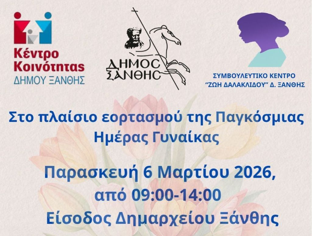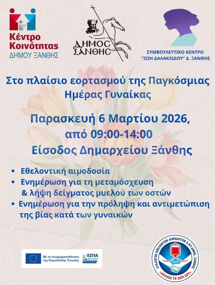 Στο πλαίσιο εορτασμού της Παγκόσμιας Ημέρας Γυναίκας, το Συμβουλευτικό Κέντρο «Ζωή Δαλακλίδου» και το Κέντρο Κοινότητας του Δήμου Ξάνθης, σε συνεργασία με τον Σύλλογο Εθελοντών Αιμοδοτών «Άπλωσε το Χέρι σου», διοργανώνουν μια σειρά σημαντικών δράσεων κοινωνικής προσφοράς και ενημέρωσης.