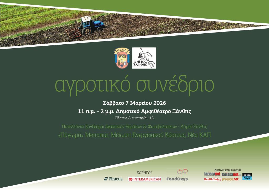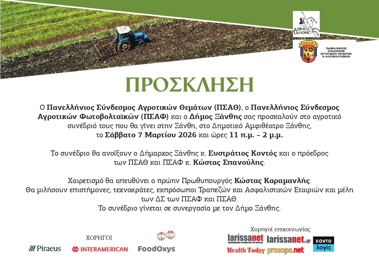 Ο Πανελλήνιος Σύνδεσμος Αγροτικών Θεμάτων (ΠΣΑΘ) και ο Πανελλήνιος Σύνδεσμος Αγροτικών Φωτοβολταϊκών (ΠΣΑΦ) οργανώνουν το φετινό τους αγροτικό συνέδριο στην Ξάνθη, στο ∆ημοτικό Αμφιθέατρο Ξάνθης, το Σάββατο 7 Μαρτίου 2026 και ώρες 11 π.μ. – 2 μ.μ.