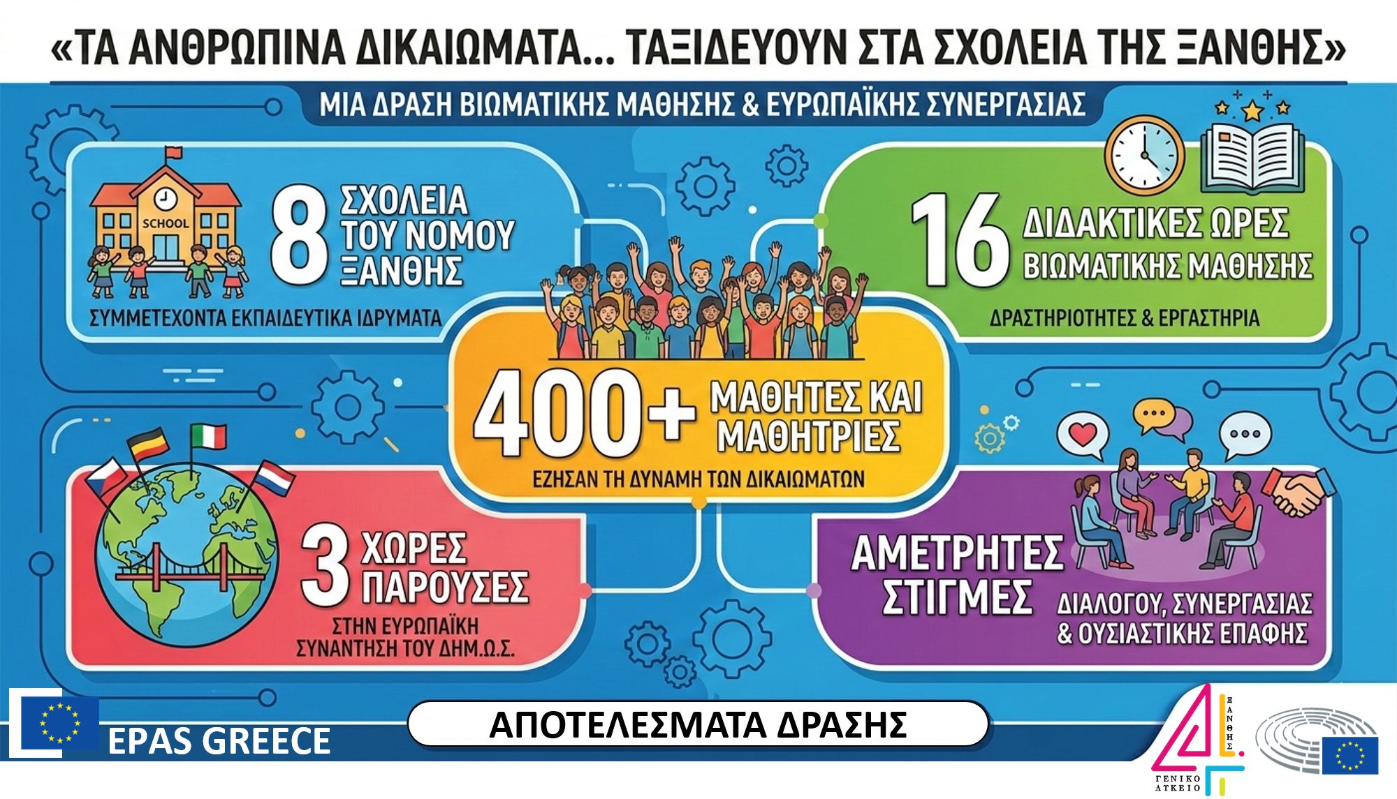 Το 4ο Γενικό Λύκειο Ξάνθης, στο πλαίσιο της συμμετοχής του στο πρόγραμμα Σχολεία Πρέσβεις του Ευρωπαϊκού Κοινοβουλίου (EPAS), ολοκλήρωσε με επιτυχία έναν εκτεταμένο κύκλο εκπαιδευτικών δράσεων με κεντρικό θέμα τα Ανθρώπινα Δικαιώματα, που περιέλαβε τόσο δράση στον δημόσιο χώρο όσο και επισκέψεις σε οκτώ σχολεία της Ξάνθης και της ευρύτερης περιοχής.