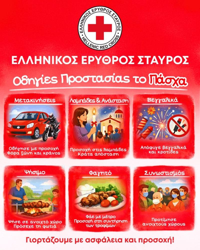 Ο Ελληνικός Ερυθρός Σταυρός, με αίσθημα ευθύνης απέναντι στην κοινωνία, συστήνει στους πολίτες βασικές οδηγίες πρόληψης και ασφάλειας για την περίοδο του Πάσχα, με στόχο τον εορτασμό των ημερών αυτών με υγεία και προσοχή.
