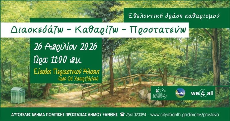 Ο Δήμος Ξάνθης, μέσω του Τμήματος Πολιτικής Προστασίας, σε συνεργασία με τη ΔΕΣΦΑ και τον περιβαλλοντικό οργανισμό We4all, διοργανώνει εθελοντική δράση καθαρισμού του Περιαστικού Άλσους Ξάνθης, την Κυριακή 26 Απριλίου 2026 στις 11:00 π.μ., με σημείο συνάντησης στην είσοδο του Περιαστικού Άλσους, από την οδό Χασιρτζόγλου.
