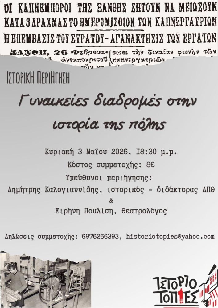 Ο χώρος της πόλης, στον οποίο ζούμε και δραστηριοποιούμαστε καθημερινά, περιλαμβάνει πολλές ιστορίες και διαφορετικές εμπειρίες από τις διάφορες κοινωνικές ομάδες, οι οποίες διαχρονικά συνέδεσαν την ύπαρξή τους μαζί του. Μια τέτοια περίπτωση, σαφώς λιγότερο φωτισμένη είναι οι γυναίκες, η παρουσία των οποίων είναι καθοριστική στη νεότερη και σύγχρονη ιστορία της Ξάνθης.