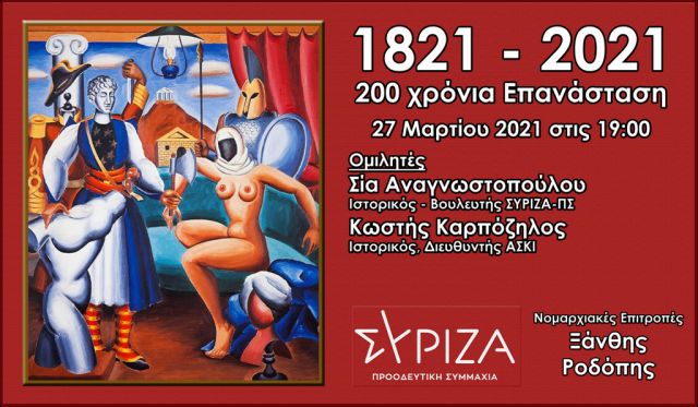Οι Νομαρχιακές Επιτροπές του ΣΥΡΙΖΑ Ξάνθης και Ροδόπης, διοργανώνουν κοινή διαδικτυακή εκδήλωση με τίτλο «1821 – 2021: 200 χρόνια Επανάσταση» με ομιλητές, την ιστορικό και βουλευτή του ΣΥΡΙΖΑ-ΠΣ Σία Αναγνωστοπούλου και τον ιστορικό και Διευθυντή των Αρχείων Σύγχρονης Τέχνης Κωστή Καρπόζηλο, το Σάββατο 27 Μαρτίου 2021, στις 19:00.