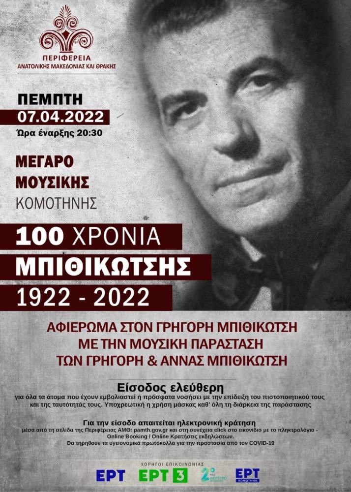 Η Περιφέρεια Ανατολικής Μακεδονίας και Θράκηςμε αφορμή τη συμπλήρωση 100 χρόνων από τη γέννηση του μεγάλου Έλληνα ερμηνευτή και συνθέτη Γρηγόρη Μπιθικώτση(1922-2022)και ανήμερα της ημέρας του θανάτου του, παρουσιάζειμια μεγάλη μουσική παράσταση για τη ζωή και το έργο του, την Πέμπτη 7 Απριλίου, στις 20.30, στο Μέγαρο Μουσικής Κομοτηνής.