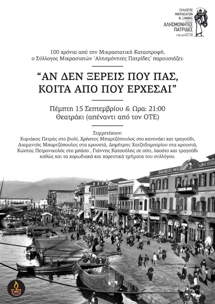 Την Πέμπτη 15 Σεπτεμβρίου 2022 και ώρα 21.00 στο Θεατράκι της Κεντρικής Πλατείας (απέναντι από τον ΟΤΕ), ο σύλλογος Μικρασιατών Ν. Ξάνθης «Αλησμόνητες Πατρίδες» παρουσιάζει μια μουσικοαφηγηματική παράσταση η οποία παρουσιάζει την μικρασιατική καταστροφή, την άφιξη και την εγκατάσταση των προσφύγων στην περιφερειακή ενότητα της Ξάνθης.