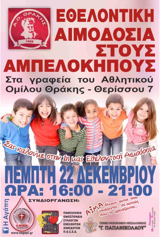 Πέμπτη 22 Δεκεμβρίου από τις 16:00μμ έως και τις 21:00μμ στα γραφεία του Αθλητικού Ομίλου Θράκης στο Δήμο Αμπελοκήπων-Μενεμένης στην οδό Θερίσσου 7, περίπου εκατόν πενήντα μέτρα από τον Ιερό Ναό του Αγίου Παντελεήμονα.