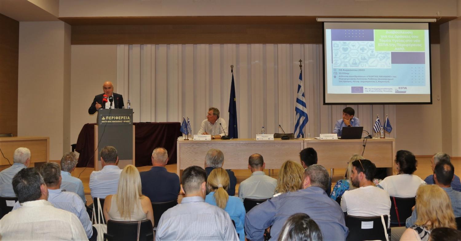 Την πολιτική της Διοίκησής του στον κρίσιμο τομέα της Υγείας παρουσίασε ο Περιφερειάρχης Ανατολικής Μακεδονίας και Θράκης κ. Χρήστος Μέτιος, σε ειδική εκδήλωση διαβούλευσης που διοργάνωσε η Περιφέρεια ΑΜΘ στην Κομοτηνή με τη συμμετοχή φορέων, δομών και συλλόγων του τομέα της Υγείας από όλη την Ανατολική Μακεδονία και Θράκη.
