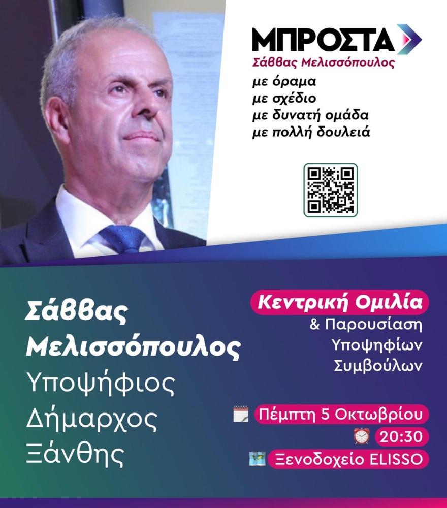 Η Κεντρική προεκλογική ομιλία του υποψήφιου δημάρχου Ξάνθης Σάββα Μελισσόπουλου την Πέμπτη 5 Οκτωβρίου στις 20:30 στο ξενοδοχείο Elisso