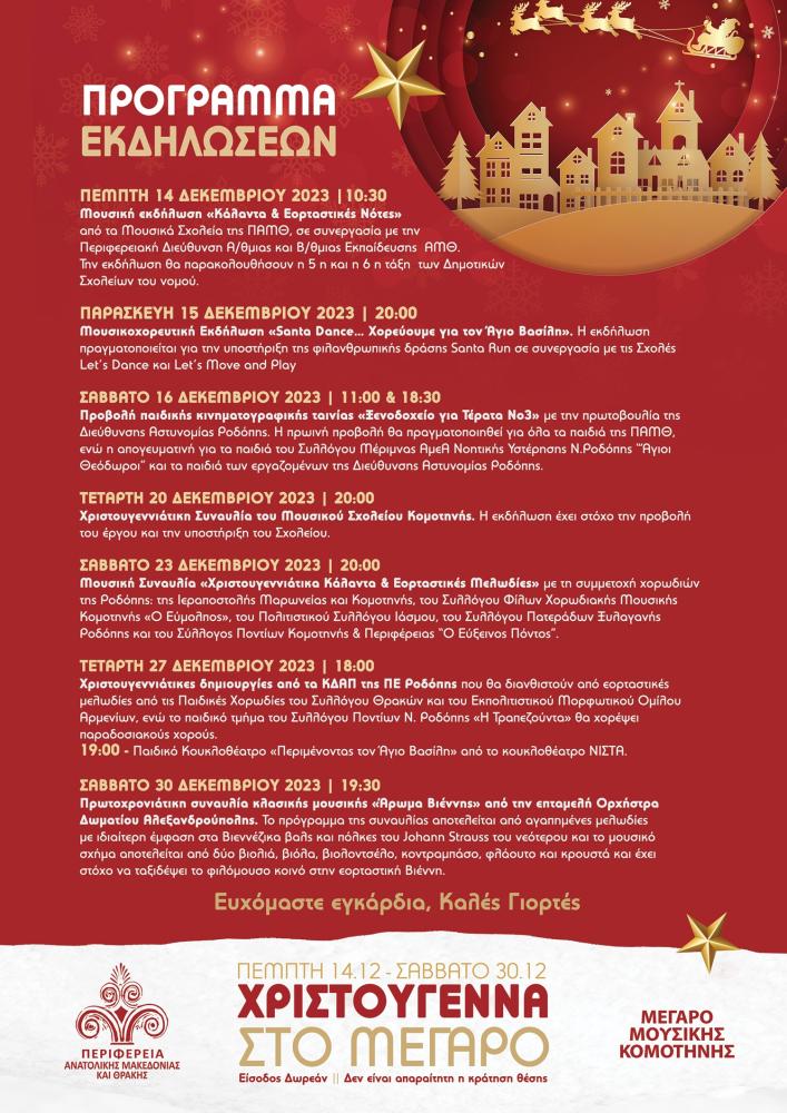«Χριστούγεννα στο Μέγαρο 2023». Υποδεχόμαστε τα Χριστούγεννα με εορταστικές εκδηλώσεις που θα ενθουσιάσουν μικρούς και μεγάλους, τις οποίες διοργανώνει η Περιφέρεια Ανατολικής Μακεδονίας και Θράκης στο Μέγαρο Μουσικής Κομοτηνής. Το πρόγραμμα έχει ως εξής: