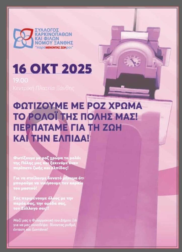 Στα πλαίσια των εκδηλώσεων που διοργανώνει ο Σύλλογος Καρκινοπαθών και Φίλων Νομού Ξάνθης “ΠαραΜΕΝΟΝΤΑΣ ΖΩΗροί” για τον "ΟΚΤΩΒΡΙΟ-ΜΗΝΑ ΓΙΑ ΤΗΝ ΠΡΟΛΗΨΗ ΚΑΤΑ ΤΟΥ ΚΑΡΚΙΝΟΥ ΤΟΥ ΜΑΣΤΟΥ" σας καλούμε την Πέμπτη 16 Οκτωβρίου 2025 και ώρα 19.00 στην κεντρική πλατεία της πόλης μας όπου φωτίζουμε με ροζ χρώμα το ρολόι σύμβολο μας και στη συνέχεια ξεκινούμε έναν συμβολικό περίπατο για να στείλουμε δυνατό μήνυμα ελπίδας, νίκης και αισιοδοξίας!!