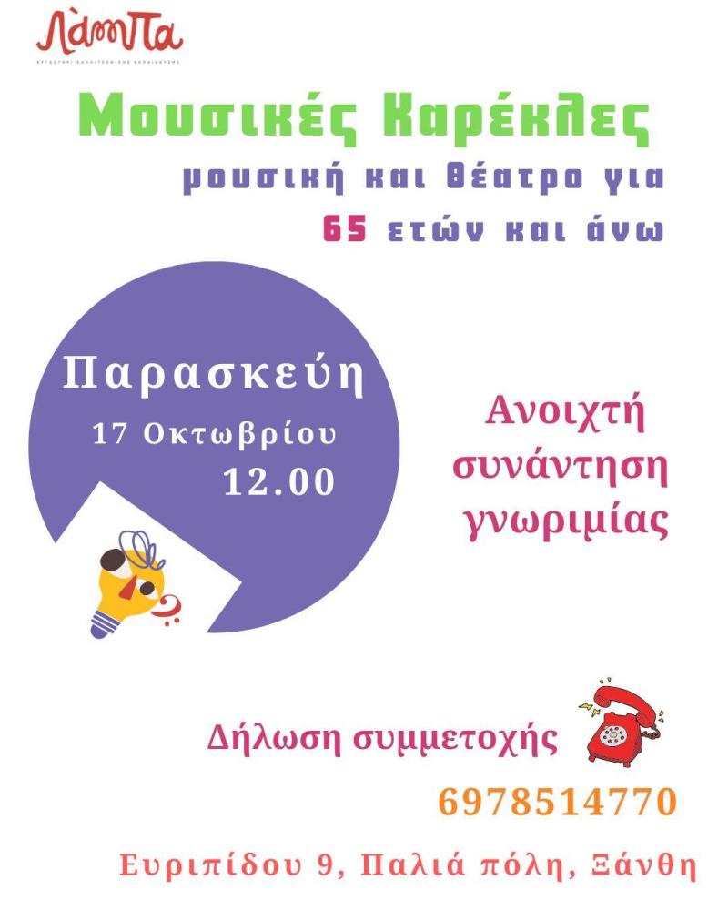 «Μουσικές Καρέκλες» , το νέο καλλιτεχνικό εργαστήριο. Την Παρασκευή 17 Οκτωβρίου στις 12 μ.μ. στον χώρο της «Λάμπας», θα πραγματοποιηθεί δωρεάν ανοιχτό μάθημα γνωριμίας