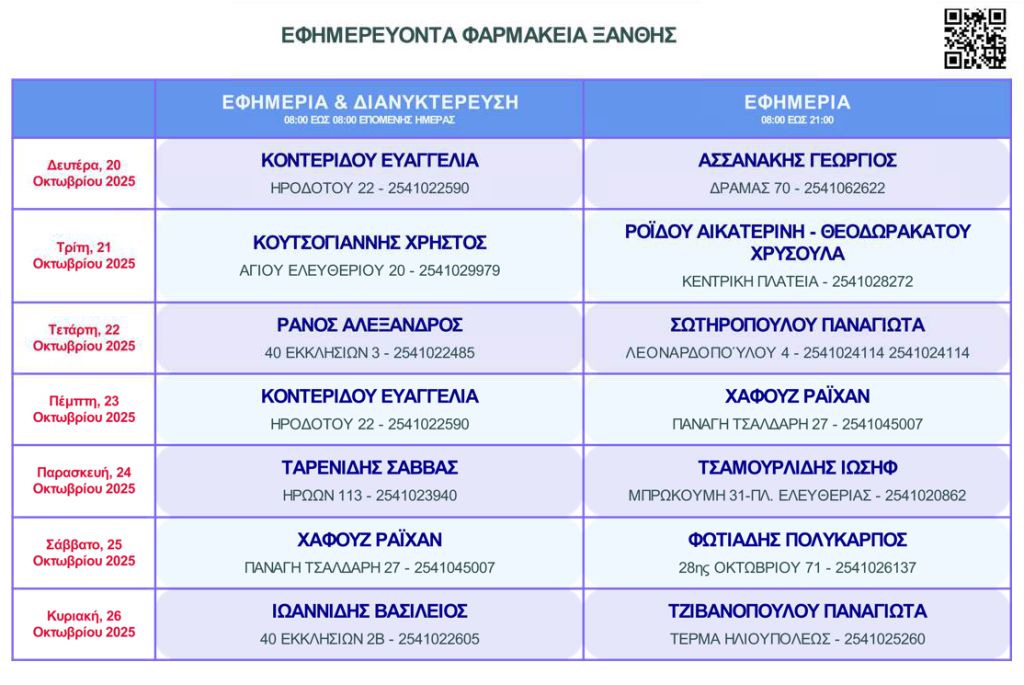 Δείτε τα εφημερεύοντα φαρμακεία από τη Δευτέρα 20 έως και την Κυριακή 26 Οκτωβρίου 2025 στην Ξάνθη