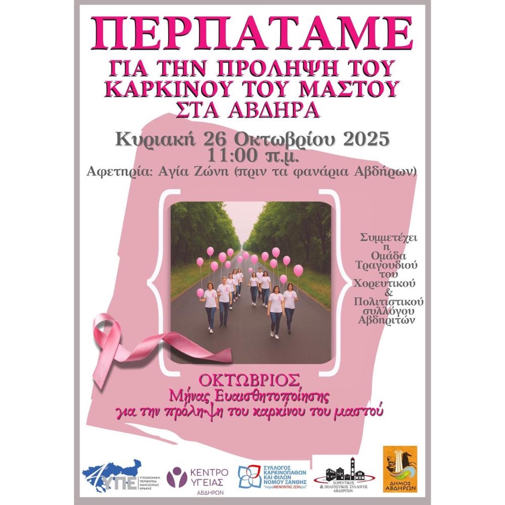 Με ένα ελπιδοφόρο μήνυμα πρόληψης του καρκίνου, πραγματοποιείται η εκδήλωση «Περπατάμε για την Πρόληψη του Καρκίνου του Μαστού στα Άβδηρα».
