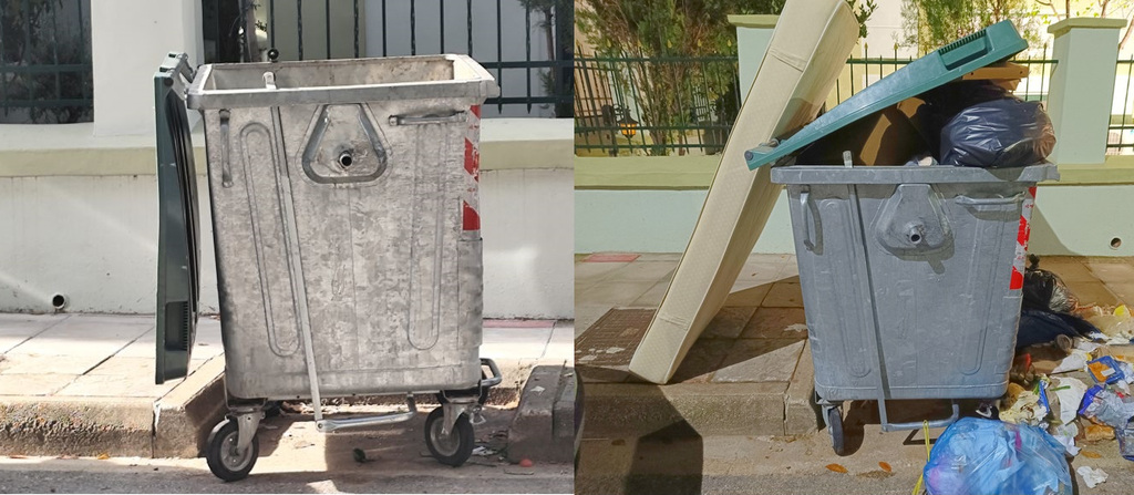 Το πρωί όμως της Τρίτης, κατά την αποκομιδή των απορριμμάτων το συνεργείο της υπηρεσίας καθαριότητας, άδειασε τον κάδο, μάζεψε τα απορρίμματα από το πεζοδρόμιο και εικάζουμε ότι ειδοποίησε το συνεργείο που περισυλλέγει τα ογκώδη αντικείμενα και απομακρύνθηκε και το στρώμα.