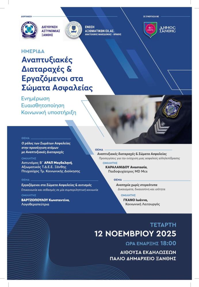 Με απόλυτη επιτυχία πραγματοποιήθηκε την Τετάρτη 12 Νοεμβρίου 2025, η ενημερωτική Ημερίδα με θέμα “Αναπτυξιακές Διαταραχές και Εργαζόμενοι στα Σώματα Ασφαλείας”, την οποία συνδιοργάνωσαν η Διεύθυνση Αστυνομίας Ξάνθης και η Ένωση Αξιωματικών Ελληνικής Αστυνομίας Ανατολικής Μακεδονίας και Θράκης, σε συνεργασία με τον Δήμο Ξάνθης, στην αίθουσα εκδηλώσεων του Παλιού Δημαρχείου Ξάνθης.