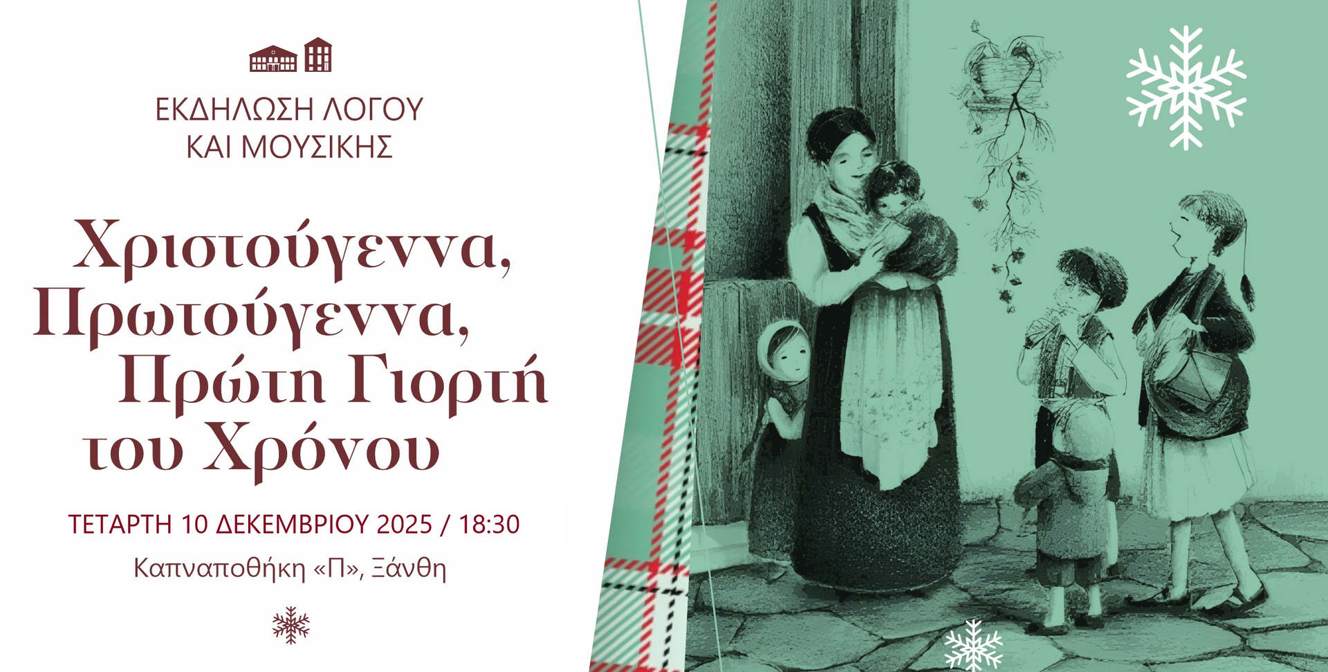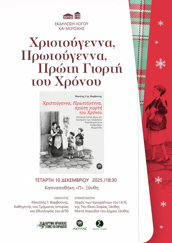 Ανοίγοντας το πρόγραμμα των εορταστικών εκδηλώσεων, το Ίδρυμα Θρακικής Τέχνης και Παράδοσης, οι Εκδόσεις Ακρίτας και το Βιβλιοπωλείο Σπανίδη, πραγματοποιούν τη βραδιά λόγου και μουσικής «Χριστούγεννα Πρωτούγεννα, Πρώτη Γιορτή του Χρόνου».