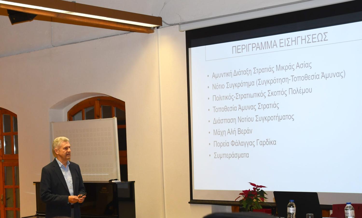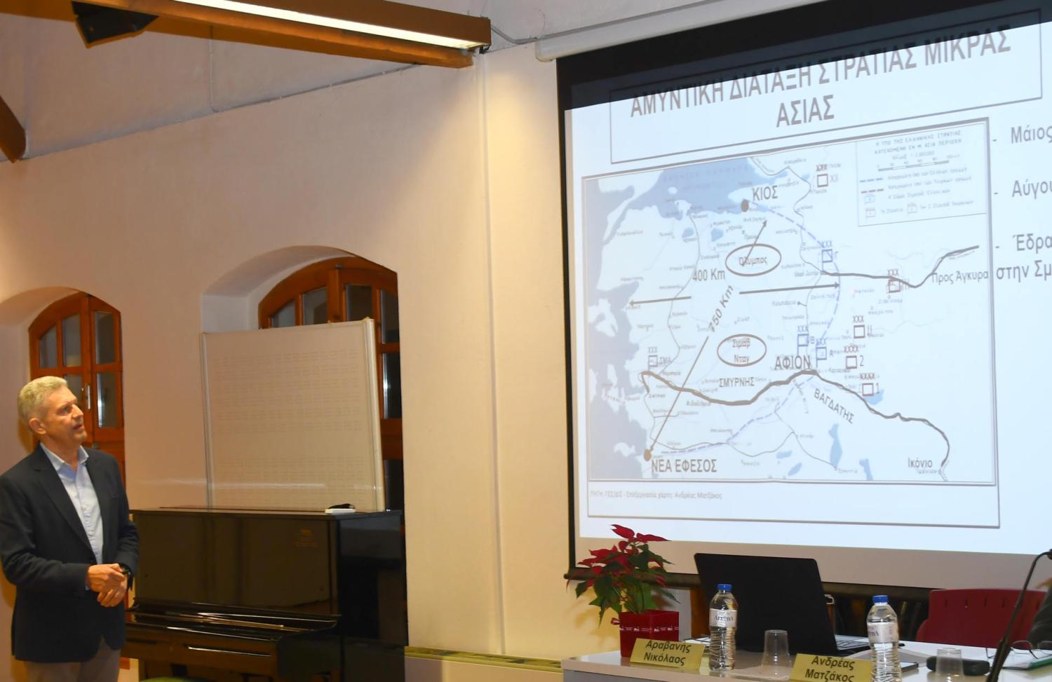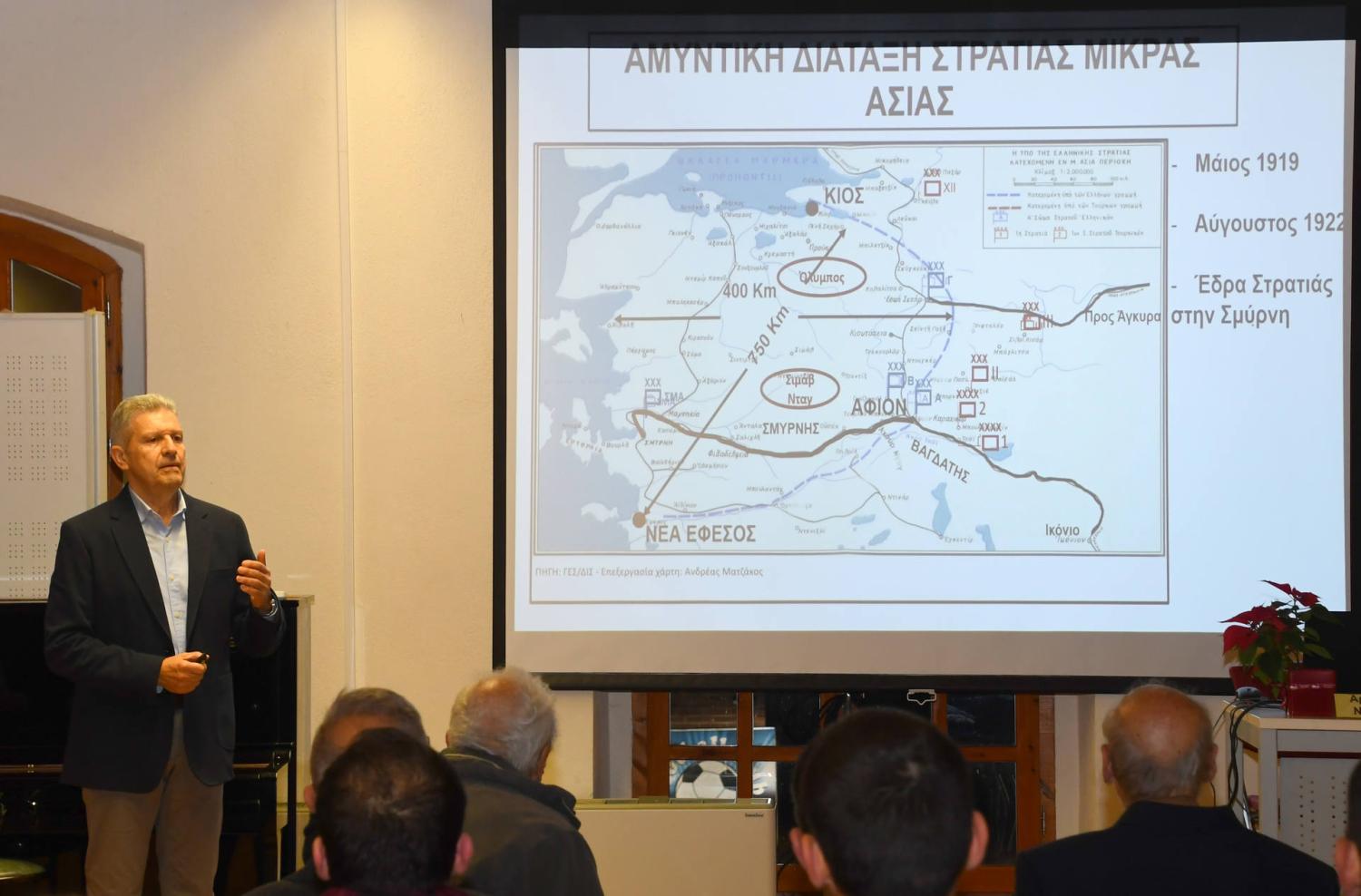 Ο κ. Ανδρέας Ματζάκος, Υποψήφιος Διδάκτορας ΔΠΘ, μίλησε με θέμα: «Γενικό Πλαίσιο Μικρασιατικής Εκστρατείας- Η δράση της ΙΧ ΜΠ υπό την διοίκηση του Συνταγματάρχη Γαρδίκα στις επιχειρήσεις του Αυγούστου 1922», παρουσιάζοντας, με συγκλονιστικές λεπτομέρειες τα γεγονότα, υποστηρίζοντας τις αναφορές του και τις αναλύσεις του με στοχευμένο, εποπτικό υλικό