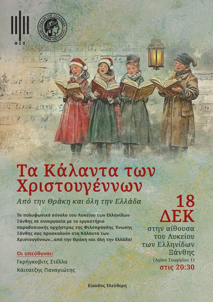 Μουσική εκδήλωση αφιερωμένη στα Χριστουγεννιάτικα Κάλαντα από τη Θράκη και από διάφορες περιοχές της Ελλάδας, διοργανώνει σήμερα Πέμπτη 18 Δεκεμβρίου, το Πολυφωνικό Σύνολο του Λυκείου των Ελληνίδων Ξάνθης, σε συνεργασία με το Εργαστήριο Παραδοσιακής Ορχήστρας της Φιλοπρόοδης Ένωσης Ξάνθης. Η εκδήλωση θα πραγματοποιηθεί στην αίθουσα του Λυκείου των Ελληνίδων Ξάνθης, στην οδό Αγίου Γεωργίου 1, στις 20:30μ.μ και η είσοδος είναι ελεύθερη για το κοινό.